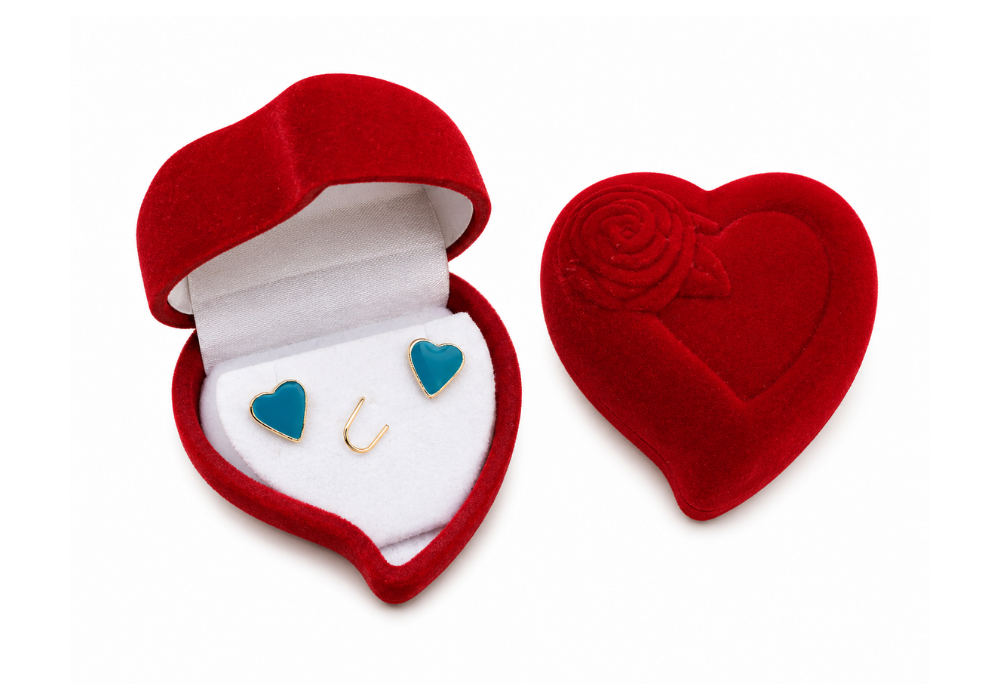 Estojo de veludo Formato Coração com Detalhe para Brinco e Corrente Medidas: 5x5x3 cm