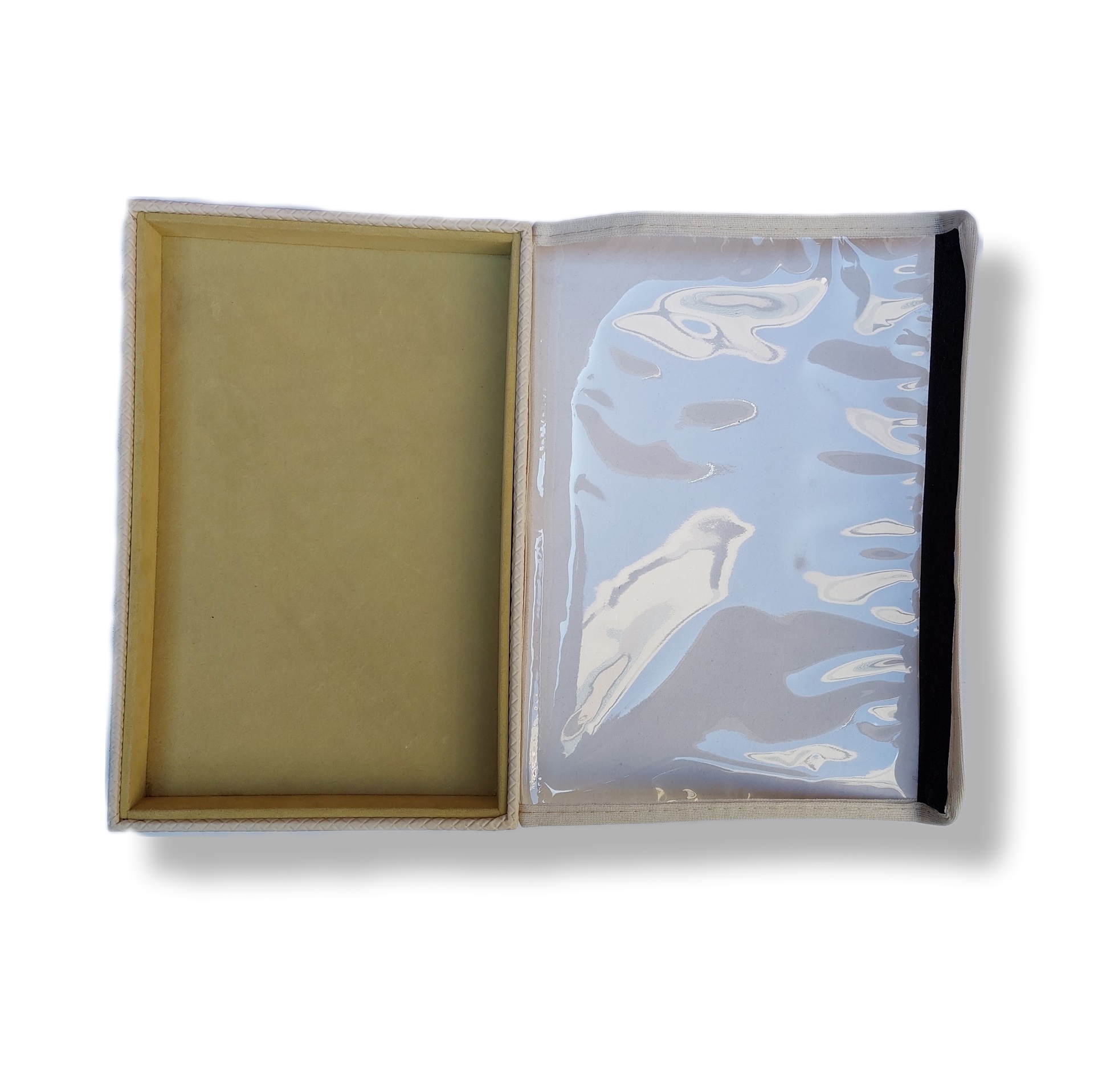 Bandeja em Courino/Veludo Liso para Atendimento,Tampa Plástico e fechamento em Velcro – medida 18x28x3 cm
